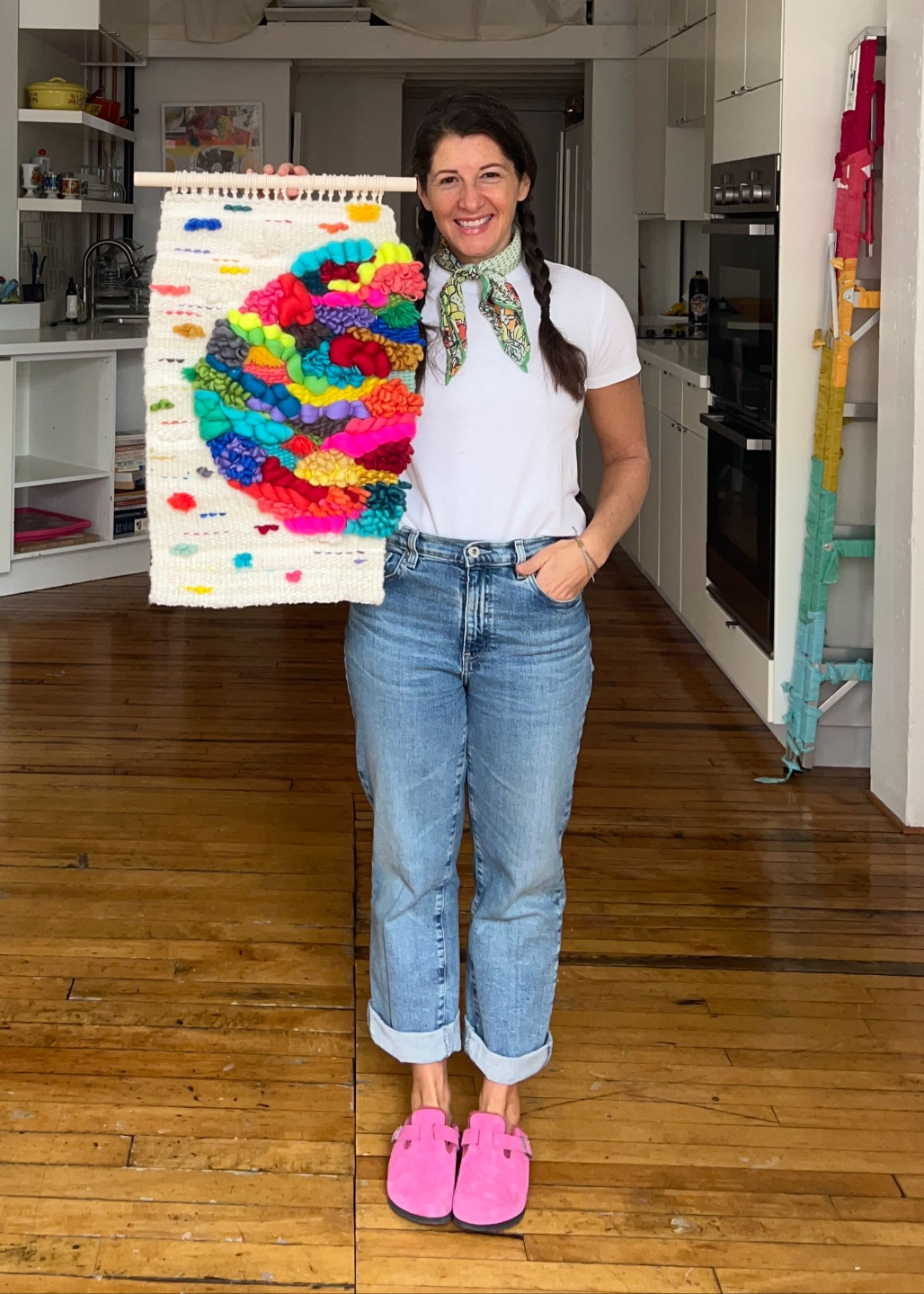 Materials:Ā Variety of natural yarns, all 100% soft mohair or 100% cotton. Woven on 100% cotton hung on Canadian soft wood dowel