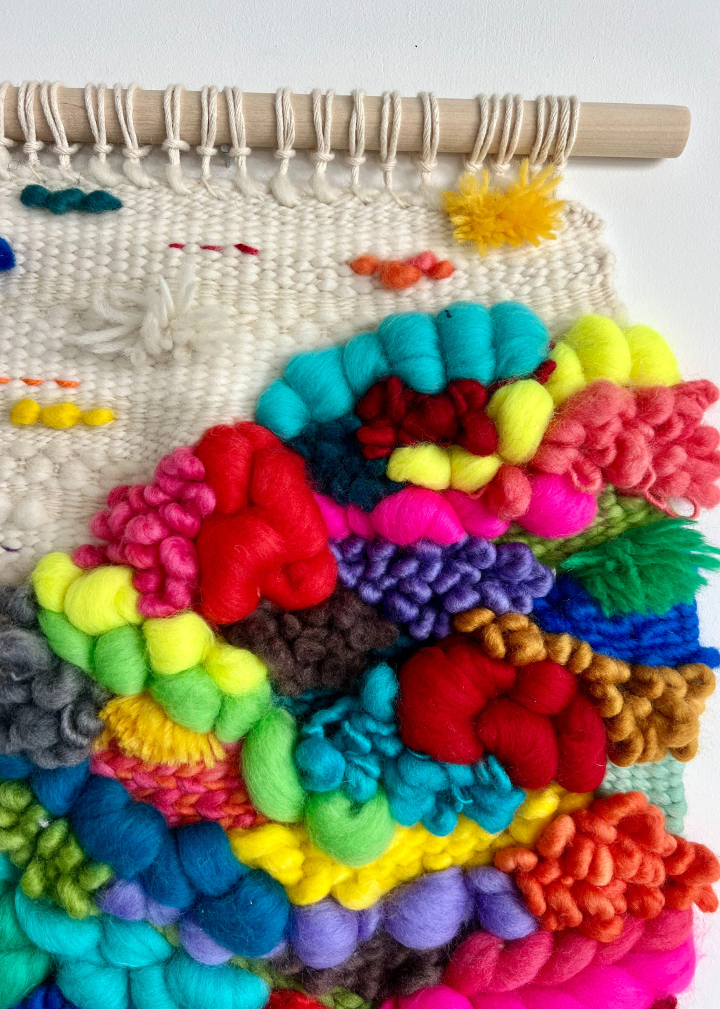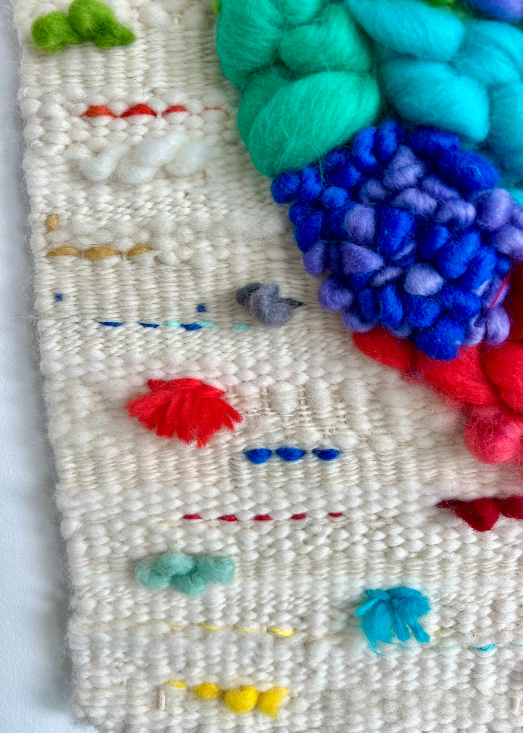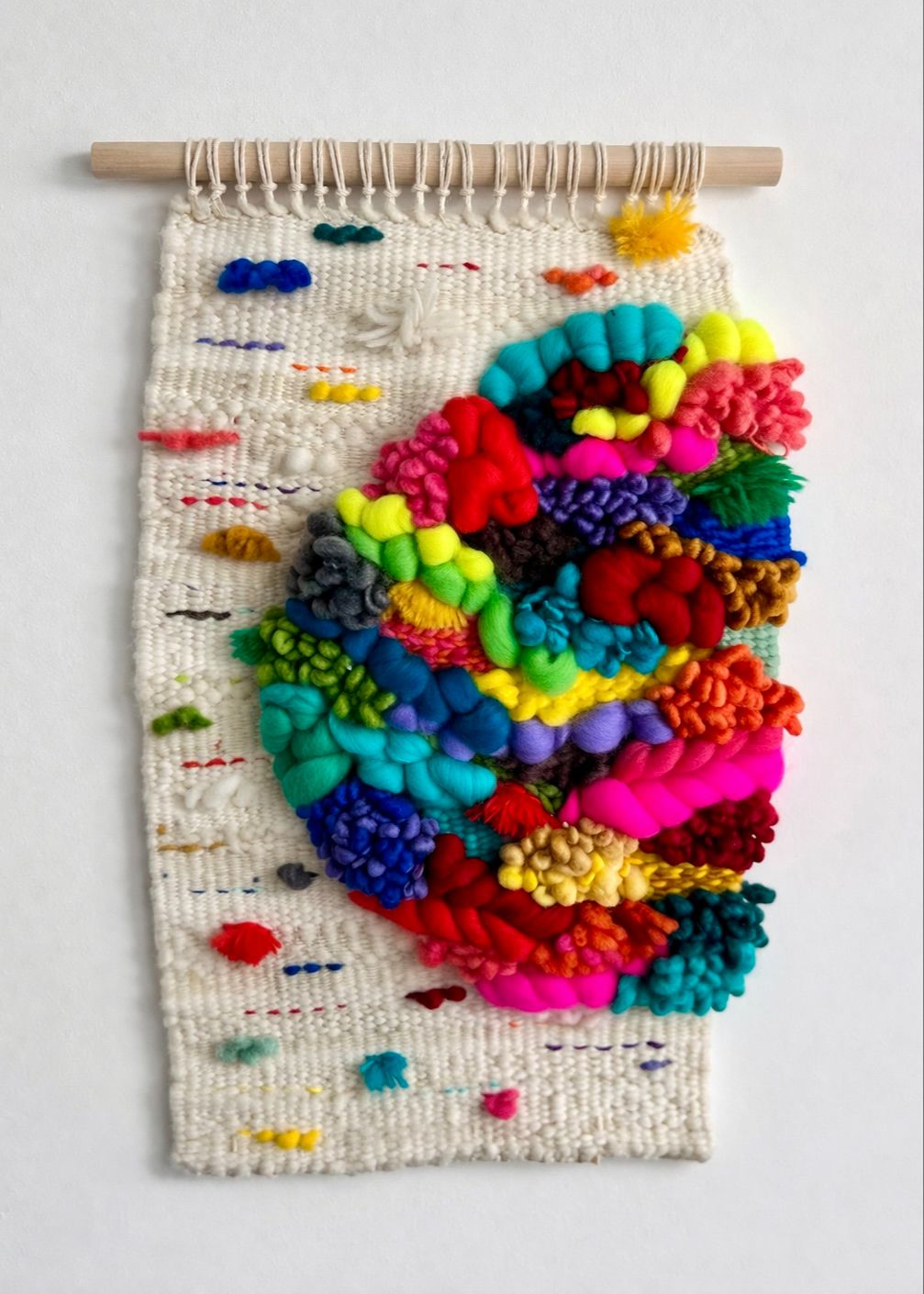 Ā A swirling, spiralling mass of texture highlighted the quiet white surrounding scattered with tiny colour marks. It's a galaxy, a storm system, and also exactly what is in our own heart core. The white space is abundant with flecks and dashes of colour and a mix of natural textured yarns, like seeds or sparks or the electrical currents that emanate from our heart centre, our core.